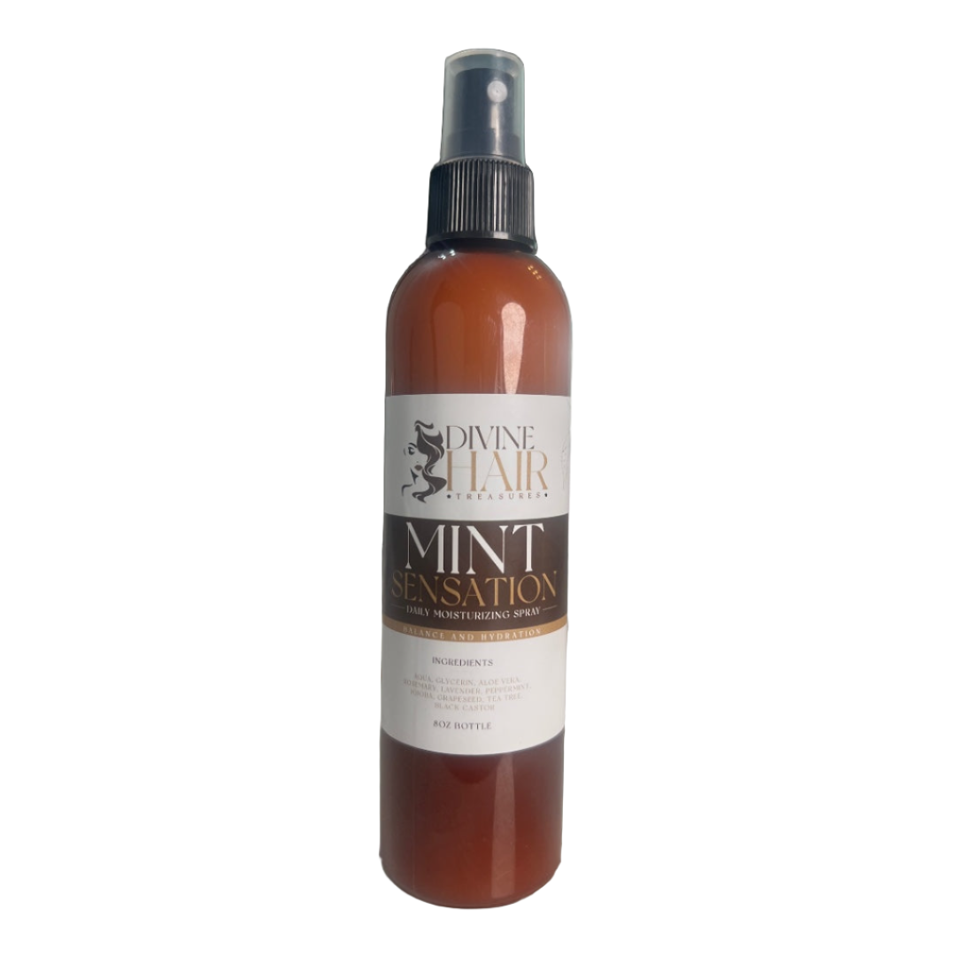 Revitalize your hair with the refreshing touch of our Luxury Mint Sensation Daily Moisturizing Spray. This lightweight, premium formula is designed to hydrate and nourish your hair without weighing it down. Infused with the cooling essence of mint and enriched with essential botanicals, this daily spray rejuvenates and detangles your hair, leaving it soft, shiny, and manageable. Perfect for all hair types, it provides continuous moisture and a refreshing sensation that invigorates your senses throughout the day.
